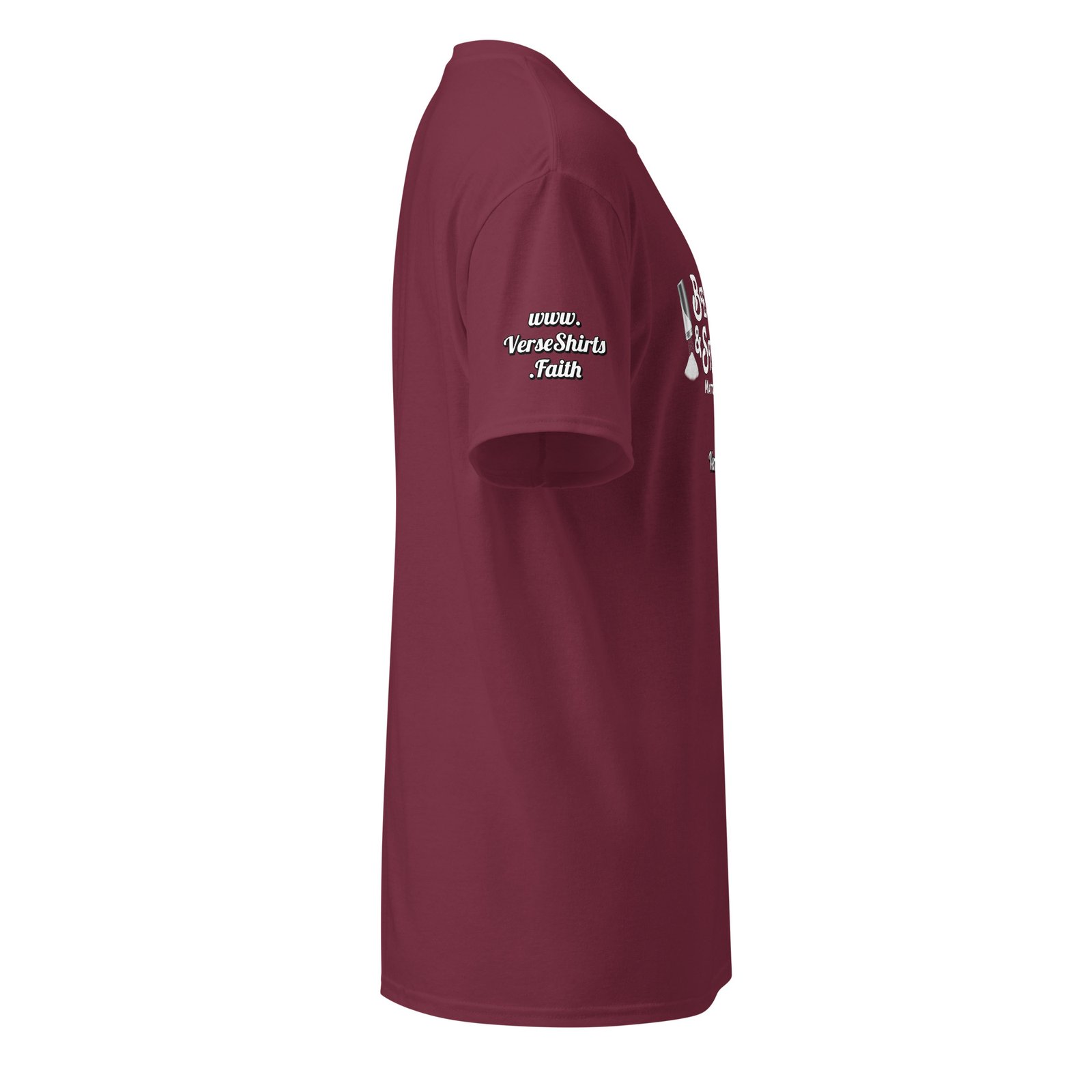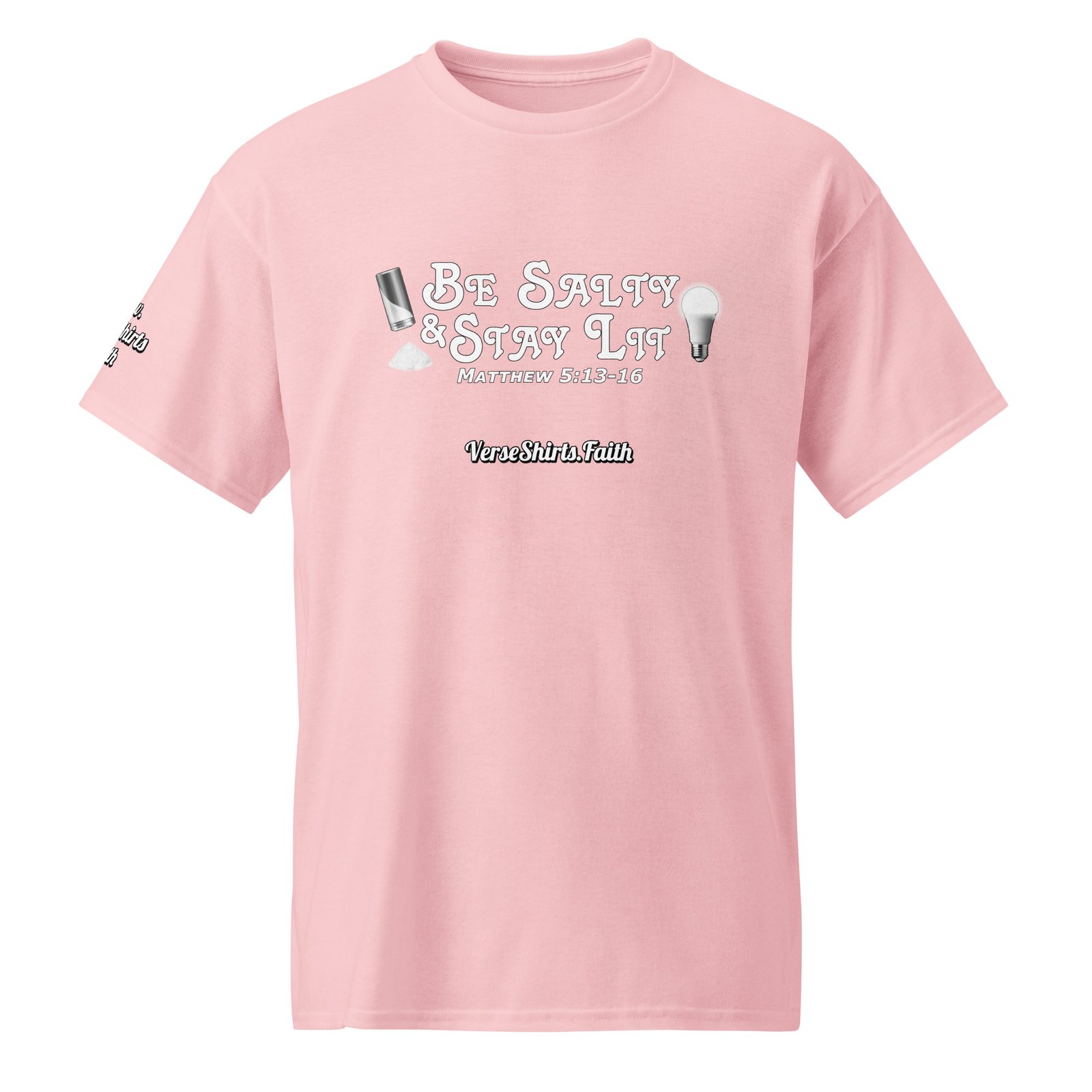 This is the 2nd version of this VerseShirts.Faith product theme. [See an alternate version of this product.] It is inspired by the Bible book of Matthew, Chapter 5 and Verses 13-16. The front shows the following text at the top “Be Salty” with the image of a salt shaker on the left side. The second row of text displays “& Stay Lit” with the image of a lighted Light Bulb on the right side. The scriptural reference text of “Matthew 5:13-16” is shown below as well as our website URL below that. The URL is also displayed on the right sleeve in a vertical position.