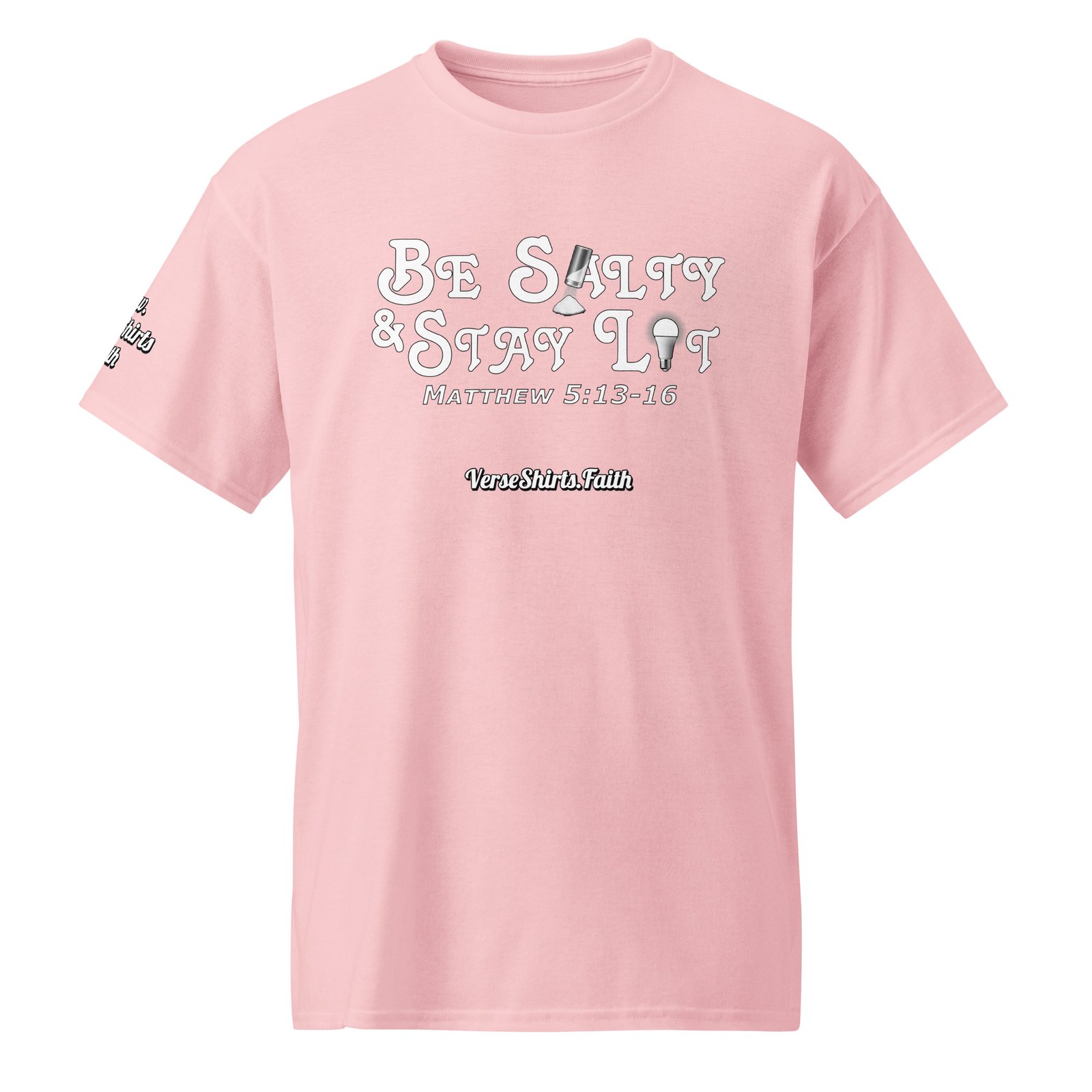 This VerseShirts.Faith product is inspired by the Bible book of Matthew, Chapter 5 and Verses 13-16. [ See an alternate version of this product. ] The front shows the following text at the top “Be Salty” with the image of a salt shaker in the position of the letter ‘A’. The second row of text displays “& Stay Lit” with the image of a lighted Light Bulb in the position of the letter ‘I’. The scriptural reference text of “Matthew 5:13-16” is shown below as well as our website URL below that. The URL is also shown on the right sleeve in a vertical style.