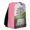 It displays a graphic image of an arrow in the form of a highway pointing up towards heaven. At the beginning of the highway, it displays “JESUS.” Overlaying the background image is the text, “Don’t let anyone think less of you because you are young. Be an example to all believers in what you say, in the way you live, in your love, your faith, and your purity.” Under the graphic image on the and across the top of the backpack, shows the text, “1 Timothy 4:12.” Our Website URL is also shown on the bottom.